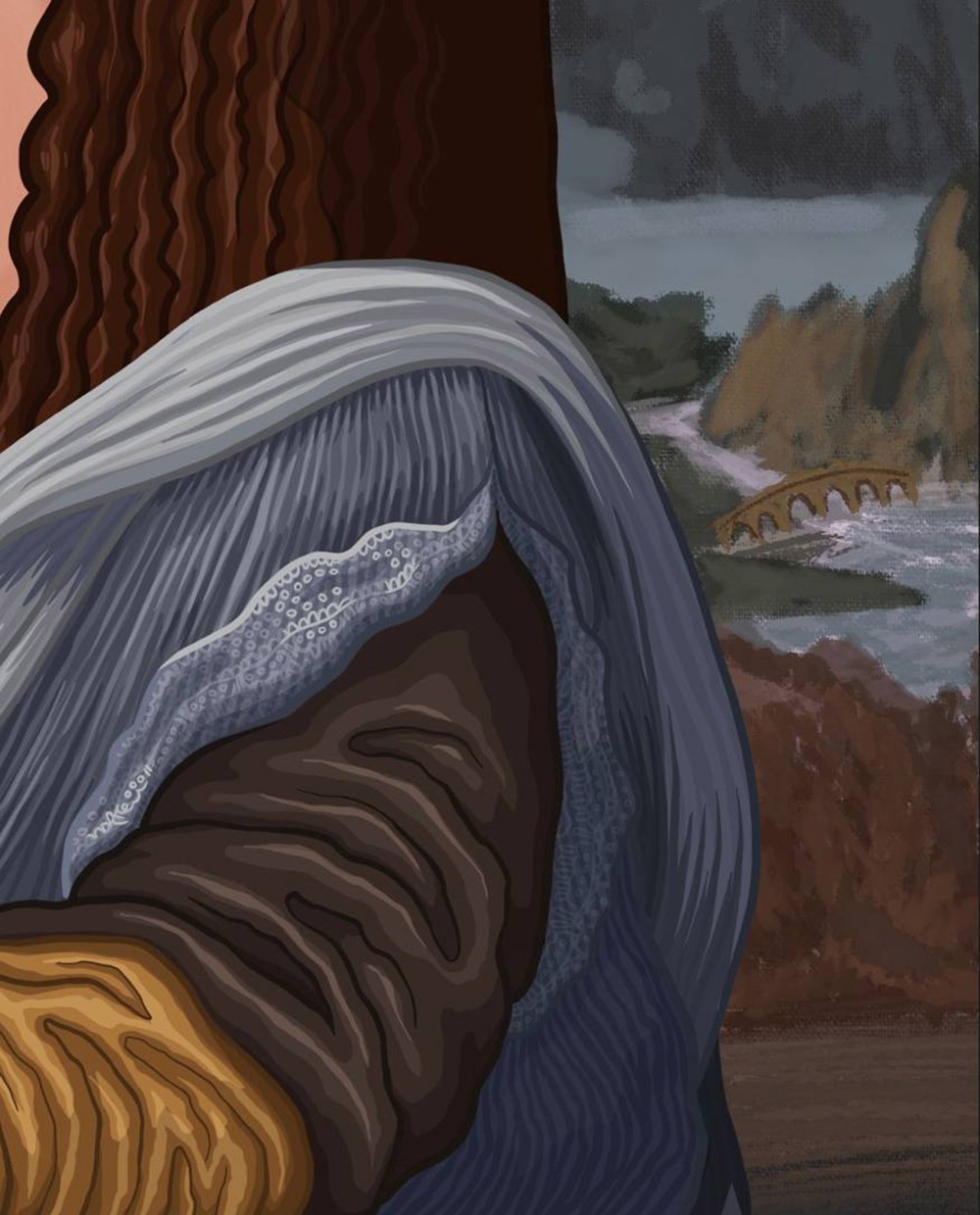 You bet I loved and dreaded doing all this fabric the whole time I was drawing 😀 Also, I never bothered to look at her long enough to notice she is sitting on a chair, on a balcony, in front of a beautiful scene with a cute lil bridge in the backgroud :O